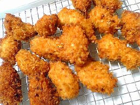 昨日の我が家の晩ご飯はこれ!わたしの母の得意料理で「ささみのやわらかフライ」とよばれているおかずです。揚げたてアツアツをパチリ☆**わたしや兄、弟は、子どもの頃からこれが大好き!弟は結婚する時に義妹に「これだけは、おかんから習って作れるようになってくれ」と頼んだらしい(笑)。それくらい大人気のおかずで今では、甥や姪も大好物なのです。作り方はと~っても簡単。* * * * * * * * * * 【材料】 ささみ 5~6本くらい 白ネギ 1/2本くらい(なければ玉葱でもオッケー) しょうがのしぼり汁 一片分くらい 卵1個 パン粉 適量 (アバウトでごめんね~) 【作り方】 1)ささみは筋をとって、包丁でこま~くたたきます。 一見ペースト状になるくらいまでしっかり細かくしてね♪ 2)そこに、みじん切りにした白ネギ、しょうがのしぼり汁、塩ひとつまみ お酒をたらーり一周くらい、お醤油はささっと一周くらい入れます。 (適当でいいので~す!) 3)さらにとき卵を加えてよく混ぜ合わせます。 ゆるめのジャムくらいの固さになるように・・。 もし、卵が少なければあと少し卵を追加します。 (たいてい1個でオッケーのはず!) これで、種は完成です。あとは揚げるだけ♪ 4)手のひらにパン粉をのっけて、そこにスプーンですくった種を ポトンと落とします。上からパン粉をまぶしてかるく握って形を整え 中温くらいに熱した揚げ油の中に入れます。 あとは、こんがりいい色になるまで、時々返しながら揚げます。* * * * * * * * * *我が家はこの分量で2人分の夕食、(ただし、オットは山のように食べます。)そしてちょっと余った分はお弁当のおかずになります。冷めても美味しいのでお弁当のおかずにもぴったりなんですよ~。そのまま食べるのが美味しいけれどオットや弟はマヨネーズをちょこっと付けて食べるのが好きなようです。オットがわたしの家に初めてご飯を食べに来たときもこれが登場しました。もちろんオットも、この味の虜となり(笑)これが食卓に上がると「やったー」と子どものように喜んでいます。そんな我が家の3世代伝統の味。ぜひぜひ、みなさんもお試しください♪ほんとに美味しいよ~。ロッテ、優勝おめでとう。そしてタイガース。今年もどうもありがとう!!楽しかったよ~。