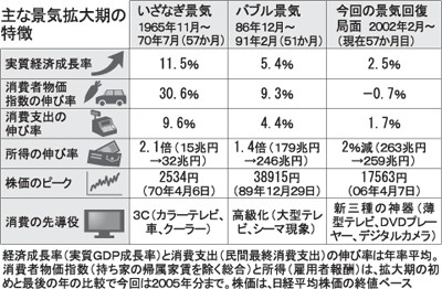 12日発表の10月の月例経済報告では、景気拡大は「いざなぎ」に並ぶそうです。しかし、財界の人ですら、実感がないという意見も多い。理由は、家を置き去りにした景気回復だからだそうです。次の表(YOMIURI ONLINE掲載分)を見ると、わかりやすい?