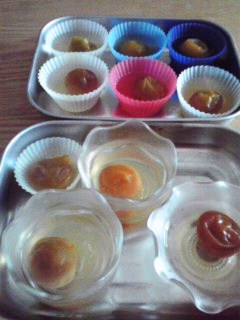 梅ジャム、活用度大です。 先日は酢豚ならぬ酢鶏のたれとして。 醤油+梅ジャム+お好みで酢を混ぜ 炒めた野菜と鶏の唐揚げに合わせます。 ジャムにとろみがあるので片栗粉は不要♪ 醤油と梅ジャムを混ぜたものにお肉を漬けて焼くのも良いですね。 さて…またまた出ました。 梅シロップの副産物、 シワシワ梅。 今回は梅の実をそのまま利用して梅ゼリーに。 シロップから取り出したシワシワ梅に 梅が完全に浸るくらい水を足して、フクフク煮ます。 シワシワ梅がふっくらしてきます。 ゆで汁の味見をしてお好みでお砂糖を足します。 適当な分量のゼラチンを、少量の熱いゆで汁でよく溶かしてからお鍋に投入。 梅を一つずつゼリー型に入れて、液を注ぎ、冷やし固めて出来上がり! 梅のエキスを取った後なですが、 梅をゆでた汁はしっかり美味しい梅風味でした。 梅の実はそれでも結構酸っぱいですが 暑い夏に「効くぅ~~!」って感じでgood!