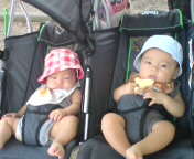暑い日がつずいていますが・・・姫のリクエストで公園に出かけてます。 一番気の毒なのが、このふたごっち 一人は抱っこ!一人はベビーカーで・・・。 この抱っこ側の子は特に気の毒で、いくら母のぬくもりが~って言われても 「あっち~~~~わ」て怒ってるにちがいない・・・。スマン。 バウンサーに乗せていると、一生懸命寝返ろうとして泣くようになりました 姫で経験済みとはいえ、忘れていることが多いですね・・・。かわいいふたごっちです 最近笑顔に癒されてます。