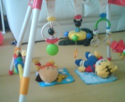 毎日暑いし、あっちゅうまに1週間過ぎちゃったかんじです。近頃は散歩も厳しいので、もっぱら家で水遊びか図書館、お友達のお家など、、、運動不足気味です庭のガーデニングも、暑すぎて元気がなさげです 双子っちはベビージムに手を伸ばすようになったので、だいぶ静かなときもありますが、二人とも寝返りしたくて、ないたり、妹ちゃんは寝返りできても、自分で元に戻れないので、よく呼んでくれます。 さすが双子!交互に泣いてくれるんで、ちょっといい加減にしてほしい今日この頃です。 姫は大好きな双子ちゃんをよくみているようで・・・アンパンマンとしまじろうがジムで遊んでおります。かわいい姫ですが。最近お調子者で、調子に乗って双ごっちに危害をくわえておりますそんなときは、母ちゃんのげんこつがとんでくるのです。(笑)