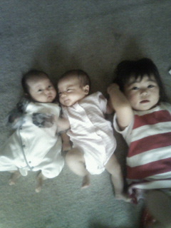 やっと我が家へ帰ってきました。家族愛にうえたパパは、喜び半分、予想外の双子育児につかれはてています。 左から女の子・男の子・姫・・・・ということで。今日もがんばって育児しなきゃね。