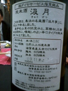 「汲月(きゅうげつ)」とパソコンで検索しても出てこない日本酒。それもそのはず、三菱系列専用の銘柄という。この酒を持ってきてくれたのは、たしかに三菱グループの会社に勤める人。裏ラベルを見ると「株式会社ダイヤサービス指定銘品」とある。三菱は「スリーダイヤ」が社章だから、やはりグループ会社なのでしょう。造っているのは滋賀県琵琶湖の最北端、賎ヶ岳山麓の旧北国街道沿いで、450年間酒造りを続ける冨田酒造です。いまだに搾りでは「木槽(きぶね)」が現役で活躍しているというのも、年間250石という手づくり蔵ならではのことでしょう。冨田酒造の主銘柄は、場所柄「七本槍(しちほんやり)」。加藤清正や福島正則等豊臣秀吉方の武将のそうそうたる顔ぶれがそろいますが、織田信長が本能寺の変で倒れた跡目を誰が継ぐかで戦った「賎ヶ岳の合戦」の舞台がすぐ近くなのですね。この蔵のある木之本町は、戦国時代は北陸と京都・尾張を結ぶ交通の要衝で、この付近では「姉川の戦い」などもあったのですから、戦火が絶えなかったようです。さて、「汲月」という名は、琵琶湖畔・長浜八幡宮の別当寺であった妙覚院の名庭園「汲月亭」にちなんだとのことです。スペック的には滋賀県産の玉栄を100%使用して60%まで精米し、アルコール度15~16度に仕上げている純米酒です。まず冷やで飲んでみたところ、香りがほとんど立たない辛口系でかなりゴツゴツ硬い。4人で飲んでいて一同、言葉がありませんでした。そこで、「これは燗上がりする」と思い、42-3度の燗酒にしたところ、見違えるような変身ぶりで、食中酒としてピッタリの濃醇旨味系の酒になりました。これには一同ビックリ、「旨い!」という言葉が飛び出してきました。冷やで飲む場合も、開栓して数日経ってからのほうが良いのかも知れません。持って来た友人も喜んでいたので、「また来る時持ってきて!」と頼みました。普段は、東富士カントリー倶楽部とか三菱地所系のゴルフ場だったら飲めるようです。ただし、冷やで飲んだらガッカリすると思うのですが・・・。