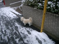 今朝起きたら雪が積もっていました。東京ではこの冬初めての積雪です。今日が土曜日で良かった、、、というわけで一日家に閉じこもってることにしました(笑)。 ぽんたは雪や雨が大嫌いです。自分の足が濡れるのが嫌なのです。でもトイレは外でしかしないので今朝も我慢の限界を訴えるぽんたと一緒に外へ出ました(先週散歩ジャンケンに負けたのにパパに代わってもらったので今日はママの番(泣))。 案の定、マンション入り口の数段の階段を下り渋るぽんた。仕方なく抱っこで下に降ろしてやると、、、 急いで雪のない場所へ移動 日頃はまるで自分の為の道であるかのように 歩道をめいっぱい使ってジグザグに歩くくせに 今日は雪の積もってない僅かなスペースを選んで歩く そして用を足すといつにない猛ダッシュで家路を急ぐぽんたであった、、、。ぽんたは雪を喜べない犬。雪だるまは南国育ちで雪が珍しいパパ作。う~む、なかなかの出来じゃ。