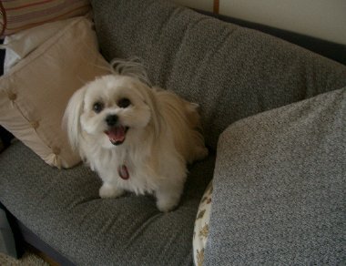 今日はパパの実家から荷物が届きました。中にはちゃんとぽんたのおやつも入ってました(おかーさんいつもありがと♪)ぽんたもその辺は心得ているのできっちり荷物チェックをし、赤い袋を発見!「くれくれぽんた」に変身です(笑)。今回はいつものハードタイプの他にソフトタイプのささみジャーキーも入ってたので、そちらを開封して1枚あげることにしました(右の画像が待てをしてるところ)。 この後どーなったと思います?普通なら「よし!」で食べますよね、、、でもぽんたはとにかく食べ物には用心深い犬。いつものと違うと認識したらサッサとソファへ持って上がり、掃除の為にソファに積まれていたクッションの丘によじ登り、決して自分では取れないであろうソファの背の隙間へと落とし込んだのであります(苦笑。下の画像は隠し終えて満足気なぽんた)。 そして何事もなく時は過ぎ夜・・・パパが帰宅したと同時にぽんたはソファへ急行!(この時にはすでに山積みのクッションは取り除かれていた)昼間落とし込んだ隙間の辺りに頭を突っ込んで探索するも、、、自分で取り出すのは無理だわな~(笑)。案の定、「ふぃーふぃー」鳴いて飼い主を呼び寄せ「私のおやつ取ってちょーだい!」仕方なく取り出してやると、マッハで食べきるぽんたであった!いつもの用心深さはどこへ??・・・そんなものパパが取るわけないじゃない(笑)。パパに何か取り上げられたトラウマでもあるのかしらね~。