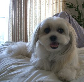 残暑お見舞い申し上げます。 今週は月曜日に美容院に出したのでまだ綺麗なぽんたです。足に毛玉が多かったのでカット代500円増しでしたよ(涙)。そして暑い時に出かけているわけでもなく家で快適に過ごしているくせになぜかバテバテな1匹と一人、、、。食欲もわかず、ぽんたも朝ご飯を食べ始めるのが午後になってから、、、ってな具合です。ま、日に1食でも口にしてればいいかと放っておいたのですが(自分が食にこだわりがない飼い主はいいかげん)、昨日の昼思い立って冷蔵庫にあったキャベツと冷凍の鶏手羽肉で手作り犬ご飯(って言ったってその2つを煮込んで最後にかつおぶしを入れただけですけど)。 とっても”いい匂い~”だったのでこれならガツガツ食べるでしょう!自信満々で「お出し」したのですが、、、、見向きもしない(涙)。鼻先まで持っていっても嫌そうに顔を背ける(なんでやねん!!)。 結局それから30分後にようやくご飯へ向かったぽんた、、、。食べてみたらおいしかったようでアッという間に完食でしたが、しかしどーしてこう食いつきが悪いのかしらねぇ。 夏ばてで少しダイエットできちゃいそうなぽんたとママです。