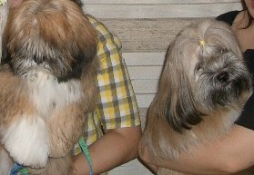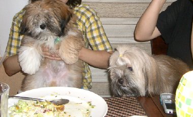 昨日、いつもブログで仲良くして頂いているmomoさんの上京にあわせ、都内の他のラサちゃん&飼い主さん達とドックカフェでお会いしてきました♪場所は代官山!飼い主には日頃全く縁のないおされな土地(爆)。 メンツは6月のオフでお会いしたダライさんとクレアちゃん、それに今回初めて会った5ヶ月の子犬アドル君。みなお利口さんでドックカフェをそれぞれ楽しんでましたよ♪犬用メニューもペロリとたいらげて(笑)。 もちろんぽんたは10歳にして初めてのドックカフェ。案の定、他のワンちゃんの存在に固まってしまったのでパパの膝の上で身動きもせず(視線も完全に逸らして目の前の犬と人を無視)、、、「ドックカフェ向き」だとダライままさんにお褒めの言葉(?)を頂戴したくらいでした(まるで躾が行き届いているかのような行儀の良さ?!爆)。 帰り道ほんの少しの距離ダライさんと車に同乗したのですが、カフェでは一言も声を発することの無かったぽんたが吠える吠える!(苦笑)車は自分のテリトリーなのでいつものようにものすごい勢いで吠えまくりダライさんとママさんを威嚇(声の大きさに驚いたでしょ?汗)。 でもまぁ無難なドックカフェデビューだったかな?今日は疲れて爆睡してます(笑)。momoさん、ダライさん、クレアちゃん、アドル君、楽しい時間をありがとうございました♪写真は左から、アドル君、ダライさん、クレアちゃん