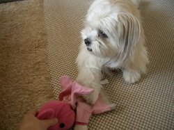 今日は朝からちょっと暑くなりそうな日差し。ぽんたはすでに食事も排泄も済ませ(今日は下痢から脱出し軟便でした)床の上で睡眠中、、、しっぽヒクヒクさせて何の夢を見ているのでしょう?? オフ会でmomoさんからたくさんのお土産を頂きました、、、来年のラサのカレンダーでしょ、「PONTA」ってネームの入った首輪、それに肉球に塗る手作りのお手入れクリームと手作りのお散歩バッグ(まるでなにかに当選したかのような豪華さでしょ!)。ダライママさんからはおやつ2袋も頂いちゃいました。それなのに、あぁそれなのに、、、、この私めは手をぶらぶらさせて参加したざんす(恥)。 と日記を書いてたところにハワイ島の家族旅行から先日戻った友人から電話。そして45分の長電話(汗)。私達も来月末ハワイ島へ行く予定なので(偶然の一致です)それに先駆けあれこれ情報を、、、っていうより、友人の「良かったよ~また行きたい♪」「いいな~私も一緒に行きたいわ♪」っていう余韻発言が大半でした!(爆)。タフ自慢な一家はゴルフ3回まわって、毎日テニスにプールにシュノーケル三昧。ついでにエステまでしてきたっていうからそりゃ満喫だ(笑)。 うちは、、、のんびりゆったり1日に1スケジュールが常なので同じ島でも感想は全然違うかもしれないわね~。写真はmomoさんにもらった首輪を前に伏せするぽんた。デブ犬の首には無理でした、、、(苦笑)おまけに写真ブレブレでせっかくの首輪のネーム見えてないしぃ~