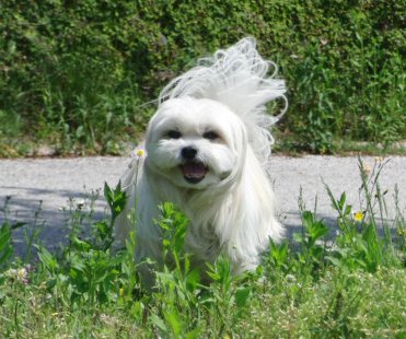 春の定番「シロツメクサとぽんた」。丘をちょこっと駆け上がる連写の中からの1枚。
