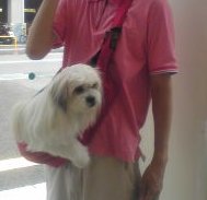 暑さがまた盛り返してきた週末です。昨日はマジで暑かった~。 先週「ペットスリング」なるものを買いました!以前から欲しいと思っていたのですがネットで見つけていいなと思った商品はちょっと値段が高め(一万超え)で、なんとなく思い切れず延び延びになってました。 でもここのところ、ぽんたの足の弱りが進んでパパの肩乗りではかなり厳しくなってきたので、なにかもっと楽に連れて歩ける手段を・・・とようやく本腰入れて探し始めました。 うちのスタイルに合っているのはやっぱりスリングタイプっぽい・・・一万超えも仕方がないか~、でも失敗はしたくないな~とグルグル考えてたら「そういえば!以前VIT君がスリングタイプのキャリーバッグに入ってたなぁ。おか~やんに使い勝手を聞いてみよう!」と思いつき、早速メール。 VIT君が使っていた商品を紹介してもらいました~(おか~やんありがとうございました!)。これはお値段も手ごろだし、ぽんたの体重(7.3kg)でも大丈夫だし、いいかも♪♪早速注文して、昨日初めて使ってみました~。 入れてすぐは足を突っ張ってましたが(苦笑)すぐにリラックス。だら~りと体を預けてうまく入ってくれましたよ!ぽんたをバッグに入れたままでも交代して持てるし、とっても楽でした。 画像は携帯で撮ったのでイマイチですがこんな感じ~。あれ?体が外に出過ぎかしら??(笑)右の画像はパッケージに載ってたワンコ。ラサの子犬かな?それともシーズーかな?