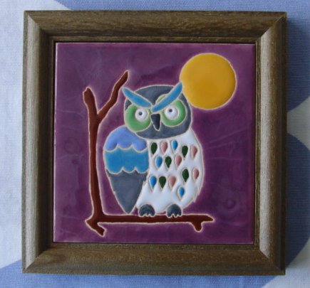 今日も気持ちよいお天気です。気候がいいのでぽんたもよ~く眠ります(笑)まだ昨日の疲れも残ってるしね。 今週の水曜日はタイル講座でした。2枚焼き上がってきたのでお披露目。 まず1枚目、11cm角のふくろう模様のタイル。焼き縮みが大きい白タイルがベースなので紫の釉薬に割れが入ってしまいました。一度焼きの時にできたひび割れに追加した釉薬が入り込んでそこが白い線になって残った状態です(残念)。先生もこういう状態になったことがないらしく???。ま、それでも十分かわいいです。これは友達用。 (図案は外国の刺繍の本から) 2枚目はハワイアンキルト柄の15cm角welcomeタイル。 これも白タイルを使いました。茶タイルとは釉薬の発色が違い、周囲の黄色が思ったより明るくなっちゃった。でもちょうどいい色の額が見つかったので、入れたらいい感じになりました!う~ん、でも文字をもっと下げた方がバランスよかったかも、、、
