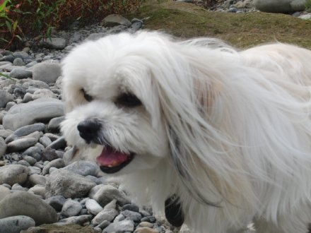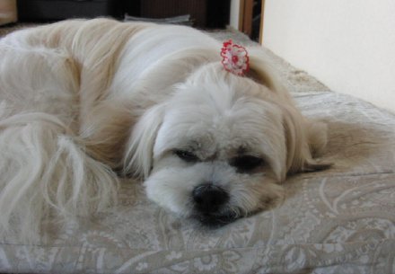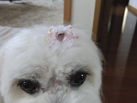 9月になって空気もさわやか、心地よい風が吹いています。 先週は父方の祖母が亡くなり通夜、葬儀と二日間日帰りで茨木まで行ってきました。94歳、大往生でした。 小さい頃に会ったきりの従姉妹たち。結婚して子供もいて・・・私はすっかり浦島気分。いとこ(男)のお嫁さんが私に良く似た人でお互いビックリ!!なんてこともありました(小学生の娘さんまで「ママに似てる!」だって。血が繋がってるのはパパのほうだよ~。笑) 今日ぽんたはシャンプーに♪今月も懲りずに「1本結びにリボン」をオーダーしましたよ。さてさてパンダの次はなんだろな~? 「ピンクのハートのお姫さまリボン」だよ~・・・お笑い系ではなかったけど(ちと残念)これまた全然趣味じゃない~(苦笑)。で、すぐに取っちゃいました。 戻ってすぐのぽんたは、ブルブルっと体を振ると後ろ足がずるっと開いてしまうくらいお疲れな状態。今日は2時間半くらいしかかかってないんだけど・・・こんな調子じゃ心配だ。