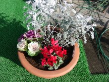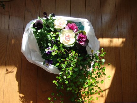 なんて穏やかで暖かい日でしょう!上着もいらないぽかぽか陽気。11月の末だなんて信じられませんね。 天気のいい日は出かけたくなるゆかちんですが今日はベランダの植物の植え付けをすることにしました。というのも週末にホームセンターでミニ葉牡丹を2苗買ってきたまま、まだ植えてなかったんですの~(^O^;)冬のベランダ作業は北風が辛くて嫌ですけど、今日は作業にぴったりの日和です。 実は私「葉牡丹」って好きじゃなかったんです。なんであんなキャベツみたいなもの植えるのかな~?ってずっと思ってました。そんな私の葉牡丹のイメージを変えたのがこのブログ。 アラ不思議!葉牡丹がバラみたいに見えます☆☆☆プロがする寄せ植えハンギング、やっぱり全然違いますね!センスいい~♪♪ この方のように美しく植えたいのはやまやまですが、すでに庭にある鉢に、うちにある植物+近所で今日買ってきた花苗少しで寄せ植え。あれ?葉牡丹が「ただの葉牡丹」に見える~(爆)。もっとたくさんぎっしり植えないと見栄えが悪いってことでしょうかね? 寄せ植え術、教えてもらいに行ってこようかな・・・