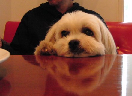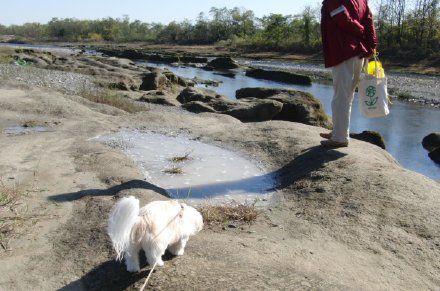 今日は暖かくていいお天気♪♪でしたが、思いきり寝坊して半日がつぶれてしまったので(汗)、またしてもくじら公園へ様子を見に行きました。 今日も水量が多くて対岸へは渡れそうもありません(がっくり)。今日は釣りをしている人が多いわ。パパが釣り場所を探してあちこち移動している間、ママとぽんたは少し下流の岸でレジャーシートに座ってまったり~。 するとJR高架下のコンクリートが打ってあるちょうど川の中央部分にトイプードルが1匹放たれていて・・・(今日は水が多くて川の中央部分のコンクリートだけが水から出ているような状態)こっち岸に渡ろうと何度も水の流れの中に足を踏み入れながらあまりの流れの早さに躊躇して戻る・・・を繰り返していて、一つ間違えば流されてしまう危ない状態が目に入りました。 水の流れを一つ越えた所に一人おじさんが釣りをしているのが見えますが、その人は犬にコマンドを出すわけでもないし、時々チラと視線はやるものの手を貸すふうもない・・・犬は何度も危ない状態になってるし、、、。「いったい誰の犬なのよ!あんなに危ないのにどうしてそのままにしておくの!!!(怒)」 そう思っていたら6,7歳くらいの女のコが靴を脱いだ足を時々滑らせながらそこまで渡ってきました。そこでプードルを抱きかかえて岸の方へ渡ろうとします。でも下は飛び石状のコンクリートだし流れが早くて幼い女の子が犬を抱いて渡るのは到底無理。何度かトライしましたが(その間もこっちは冷や冷やしてるのに周りにいる大人は誰も手を貸さない)結局諦めて犬を置いて一人岸へ戻りました。岸では父親らしきおじさんが女の子を待っていました???・・・なんで大人がいるのに運んでやらないの!? ・・・って思ってたらそのおじさんと女の子はその場からいなくなっちゃった~(唖然)。犬は?あのプードルは誰の犬なの~?なんで一人であんな場所に置いておかれてるの~? パパの姿がその遥か向こう側に見えたので急いで携帯を鳴らす・・・出ない!(おいっ)何度も鳴らす・・・出ない(おいおい)。しつこくかけたら何度目かでようやく着信に気がついてくれた「パパ!そのプードルがさっきから危ない目にあってるのにだれも助けなくて飼主が誰なのかわかんないの!さっきこっちへ連れてこようとした女の子はなんでか帰っちゃったし、その脇で釣りしてるおじさんが飼主かどうか確かめてみて!もし違ってたら捨てられちゃったのかもしれないから!!」マジで焦ってパパに声をかけてくれるように頼みました そしたら・・・流れを一つ越えた所で釣り糸を垂れていたおやじが飼主だった(激怒)。しかも連れは息子だという(じゃぁさっきの女の子はなんだったんだ?見かねて助けようとしてたのか?) 「水を全然怖がらないんですよ~!フレンドリーで誰にでも付いて行っちゃうんです」と言ったらしい・・・(呆れ)お前が犬のついていけない場所に入って釣りをしている間、明らかに怯えて鳴いていたじゃないかっ!飼主の側へ行こうとして何度も流されそうになってたのに・・・阿呆か!! 他人事ながらそのおやじに頭にきたし、ちょうどパパの釣りの仕掛けも壊れたので早々に川岸を後にしました。 帰り道、ドックカフェを検索してたまたま近くにあった店で食事。ぽんたは初めいつものように緊張して震えていましたが、そのうちに慣れて(他にお客が一人しかいなかったし看板犬は仕切りの向こうだった)、お得意のテーブル顎乗せポーズでウトウト(笑)
