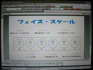 先週、新規利用者さまのお宅へ訪問 病気からの激痛があり、強い薬を使用している・・・ 病状を把握するために 『フェイススケール』 を作製 疼痛の共通スケールなのですが・・・ 利用者さまが指差ししやすいように、A4サイズと~ 大きく作りましたぁ しっかり~ ラミネートも これからの稼動で~ 役立ってくれるかなぁ