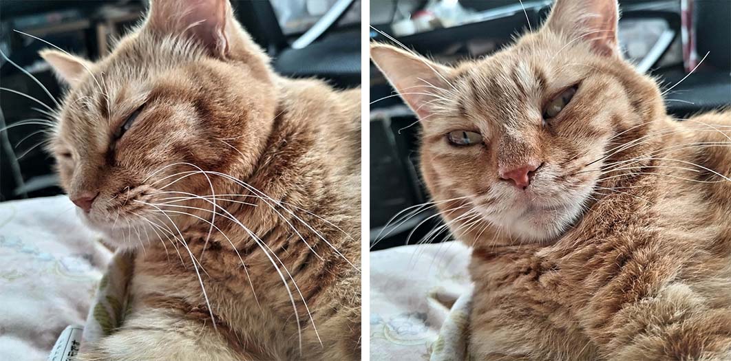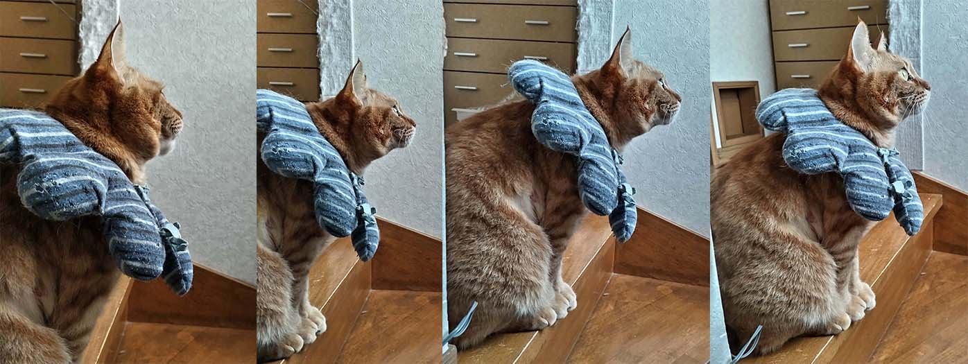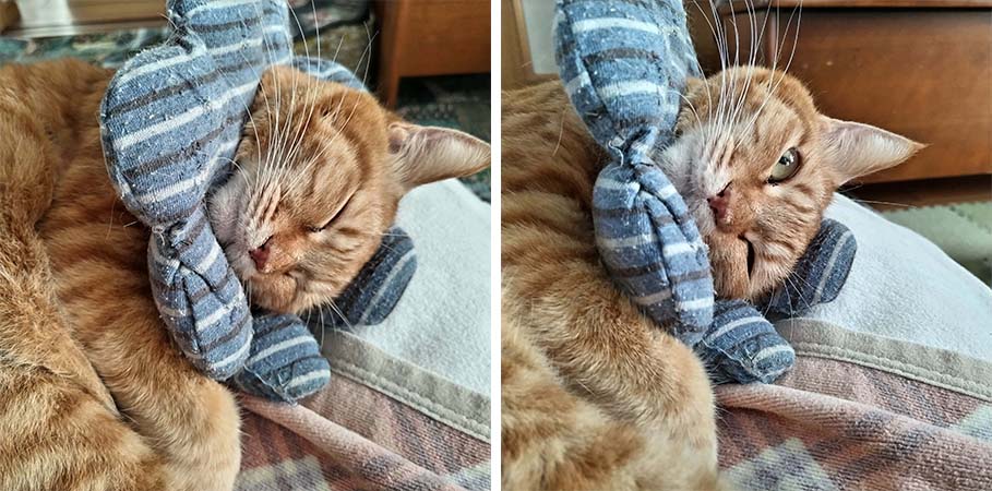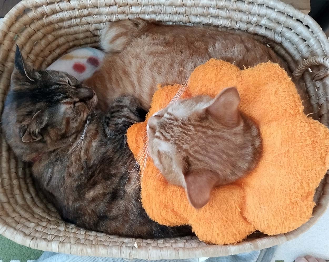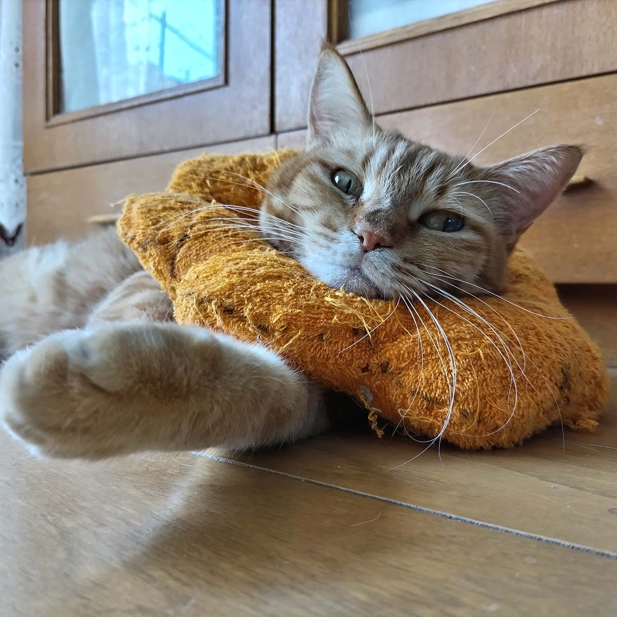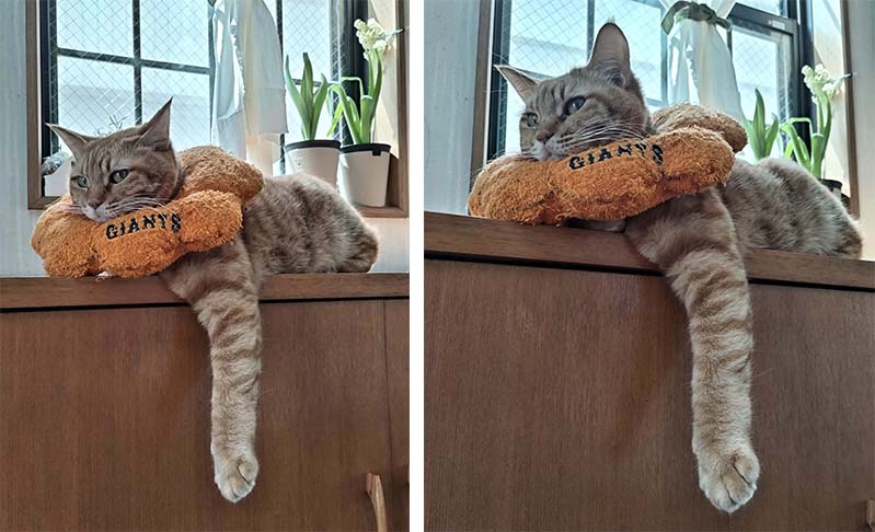 なんて寝方をしているのかなにも狭いところでくっついて寝ていなくても・・・日向ぼっこ猫枕 空ちゃんの尻尾