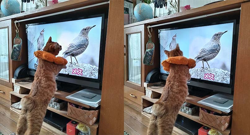野鳥の動画を観ていたら、空ちゃんが食い入るようにジッと見つめていたと思ったら、TVに近づいて・・・・
