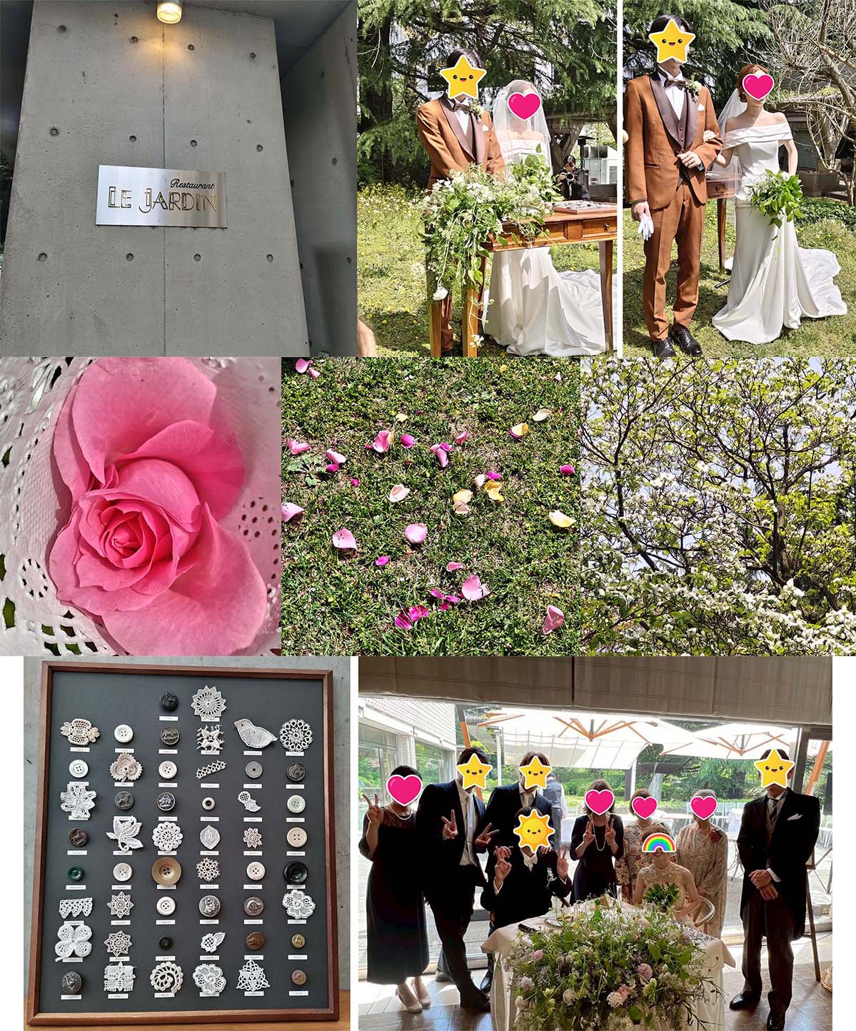 今日は甥っ子の結婚式だった世田谷美術館内のレストラン”ル・ジャルダン”10時集合だったので8時過ぎに家を出て若干環8が混んでたくらいでスムーズに1時間10分で到着した駐車場で時間調整していたらふたりが写真撮影しているのが見えた新婦のYさんもの凄く綺麗 甥っ子もスラッとしていて様になっていた人前式で新緑の中晴天に恵まれ、ガーデンで挙式桜は終わってしまったけれど、丁度花水木が満開だった総勢50名の式に全員が参加参加者全員が幼なじみから高校、大学の同級生~院生、入職時の大阪で苦楽を共にした同僚、学生時代のバイト先の古着屋さんのスタッフ等気心の知れた仲間達だった新郎新婦入場前から各テーブル、ビールで乾杯していてヾ(-@@-;) オイオイって感じだったけれど「今日は上司等ひとりもいないで・・・」と甥っ子の挨拶で会場がドッと沸いた親族の私達・新婦側のご両親祖父母の8名だけが60才台から上って感じで二次会無しっていうのも頷けたもう何十年、結婚式なんて参加していなかったけれど、今ってこんな感じなのかステキなお式だったお食事も美味しくてケーキカット&ファーストバイトの後はケーキバイキングでテンション たくさん食べたかったけれど、それ以前に結構満腹状態だったので一皿で終了オープニングDVDからお色直し中のプロフィール映像上映そしてエンドロール映像上映では人前式からパーティー終了直前までの模様が流れ流石プロの仕事、編集の早さにビックリした(記念にもらったら凄い思い出になるだろう 私も欲しい)お見送り時には飾られていたお花がお持ち帰り用に準備されていてたくさん頂いちゃった帰りは前泊していた兄たちも一緒に帰ってきた(兄たちはお酒が飲めないからと電車で行き、近くのホテルで宿泊 帰りは飲まない私のクルマでちゃっかり同乗しての帰宅って感じ)本当にステキな甥っ子夫婦と仲間達へのお披露目パーティーだった式の後、それぞれの集まりに顔を出すと言っていたそうこういう時じゃないと同窓会と同じで会えないから、幼なじみ、中高時代、大学時代、入職時の仲間も話し足りないから飲むんだろうな~