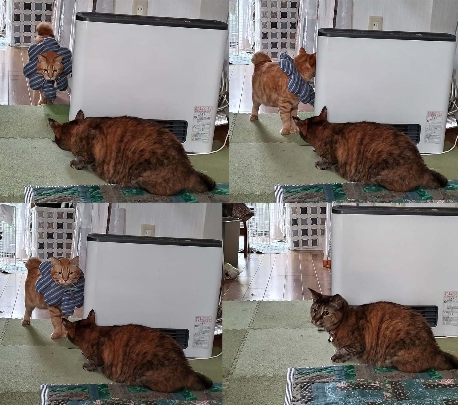 空ちゃんに飛びかかろうとしてストーブの影に隠れている鈴ちゃん近づいてくる空ちゃんあともう少し・・・お尻フリフリして飛びかかろうとした・・・あららタイミングを逃して空ちゃんは行ってしまったあららら・・・・鈴ちゃんの表情ったら・・・