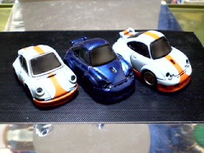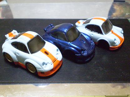 作業は、ガルフブルーに、オレンジラインを吹きました。乾燥後に、ウインドウ回りをシルバーを吹き、 スモークで多少グラデーション(あまりついてない)をつけました。3台ともまだ、細かい修正をして、RSは窓枠をシルバーに塗ります。