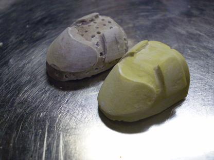挑戦です!今年初めての、Q作業はキャストブロックから削りだしをしてみました。私の使っている、キャストはウエーブの物ですが、結構硬く、家のリューターは非力で、最初はカッターで削っていたのですが、案の定手を、切りました。結局、非力のリューターで、作業しました。本当は左からやりたかったのですが、型にデッサンしたのが右で、キャストに写ったのが右、しょうがなく右スタートです!もん太さんが、使っている工業用のものは、もっとかたいのでしょう?どうなることやら?