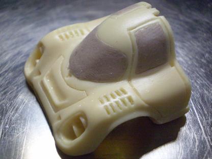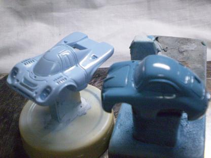 掛かりました!最初にライトカバーを作る為の顔作りました。ピンクのは、型どりくん 青い方はブルーミックスで値段はブルーミックスの方が、かなり高かったような気がしますがためしに、複製してみたら、型どりくんの方がきれいに、とれました。つぎは、ライト回りの彫りで、ここまでは、なんとか進んだんですけど左右のスリットが大失敗!!隣との間隔を調整してたところ一本折れてしまい、しょうがなくスリットの部分だけ、別パーツにしようと思い、フェンダーの上の所だけくりぬこうと、削っていたのですが、案の定タイヤハウス側まで貫通してしまいました。貫通した先にあったのは、左手の中指でした。右側を削って、左側も同じようにやってしまい、中指を二箇所刺しました。キャストで、スリットの部分少し山になるように作ったのですが、フェンダーにつけたとき、山の形がずれてて、結局山を削ったらスリットの深さが少なくなってしまいました。次また、修正です!
