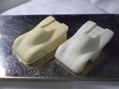 やっと型が、出来たのに・・・まずライト回りの、カバーを付ける為の、掘り下げ部分スリット部分、まして2台目を型から取り出す時型が裂けました。 これは、型の作り方が悪かった為?リヤの型の壁が薄すぎたのだとおもいます。原型も型から取り出す時に破損しました!!もう、複製したものを修正して、また型作らないと・・・ボディの皮を、つくるのには型裂けは、大丈夫なのですがやはり、スリットとライトカバーの所が、ダメです!!