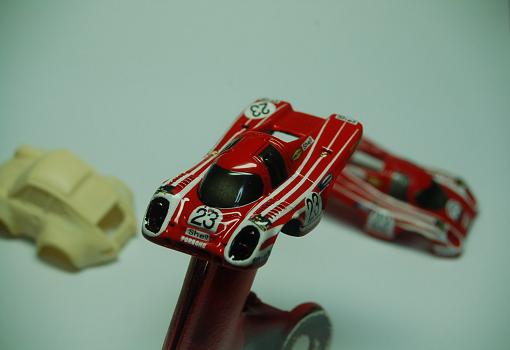 1ヶ月以上もブログ更新お休みしてしまいました!!何もしてなかったわけでもないのです!!殆ど毎日、イラレを練習していました!アーでもない、コーでもないと、ずーっと・・・途中kamQさんに聞いたり、カレラさんに教えてもらったり、hisaさんからは、EPSデータをいただいてしまいました。みなさん、色々有難うございました。今までイラレを使っても、ちっとも覚えず、その場だけで終わってしまい、次に使う時にはもう忘れていて、いつも凄く時間が掛かってしまっていました。この際だから、徹底的に覚えようと頑張ってみました。結果は、まだまだです!!もっと練習しないと・・・只今、製作中のQは1970年のルマン優勝車917K SALZBURGです。本当はお決まりのガルフにしょうかと思ったのですが、もう3台作っているので、今回はこれにしてみました!台数を沢山つくらないので、ヘッドライトからのラインは塗りにするつもりでしたが、細いラインを左右同じようにマスキングする自信はなかったので、デカールで再現しました。白は数回重ねて印刷したのですが、家のプリンター所々変なスジが出て(随分前から)おかしいんです。デカールを貼り終えてから、スーパークリアを吹いてから白のおかしい部分を修正していま乾燥中です。シャーシは自作で抜いたものが1台だけあったのですがリヤはお決まりのパイプフレームを真鍮線で再現してます。今回は、ミッション周りを新たに作り直して、テールパイプの取り付けかたも、実車と同じようにしてみました。もう1台ボディ製作途中ですが、こちらはシャーシがないのですべて真鍮製(モーター、タイヤ&ホイル以外)で製作中です。完成後どちらか、某オークション出品予定です!!