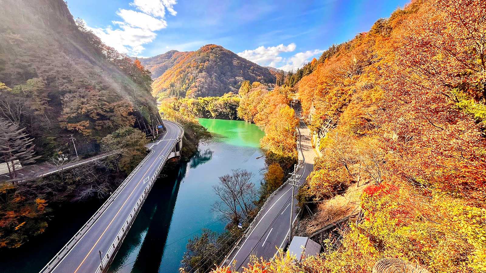 終わりかけの紅葉だけど、エメラルドグリーンの犀川と青空の相乗効果で