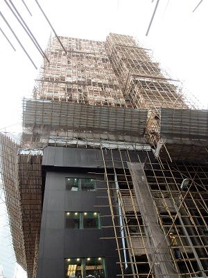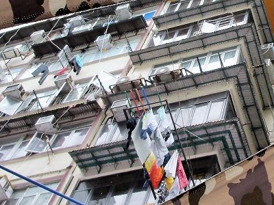 天幕の合間から撮ったマンションからつきでる物干しざお。