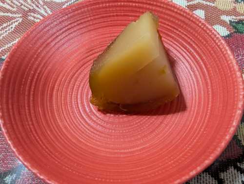 ゆず羊羹を砂糖漬けの柚子の皮で包んだもの。