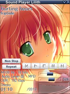 このパソも工業仕様になったものですね。いいことです。 さて、テスト前に音楽プレーヤーlilithを紹介しましたが、そのときに、時間があればフェイス作ると言っていたので作ってみました。完成度は90%ってとこです。なのでVer0.1にします。使えないワンクリック機能は・プレイリスト作成・曲目選択・左右バランスの調整です。普通に使う分には不都合はありませんので使ってみてください。この上2つの機能は時間があるときに追加する予定です。最後はスペース上無理・・・ そのスキンとは・・・ ある人のリクより作ってみました。画像の加工が面倒でもうね・・・でもとにかく動きます。そしてダウンロードはここ。まずlilithをインストールしてからzip中に入っているiniファイルを当ててください。わからなければコメントへ。黒い裏情報このスキンはですね・・・他の方が作った素材&レイアウトの一部を転用してるんですよ。だからおおそれと公開できるものではないんでひっそりと公開します。zipにはパスありです。パスはこのキャラの「名前」を半角英字で打ち込んでください。明日には削除します。