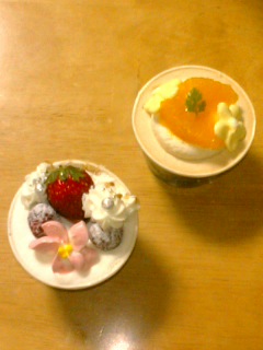 苺のはショートケーキ☆みかん?がのってるのは紅茶☆チョコのは濃厚でおいしかったぁ☆抹茶は全然きつくなくて食べやすかったです☆見た目も可愛いし満足(●´∀`●)ノ