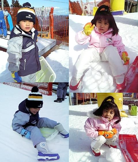 先週の土曜日に子どもたちとスキーの初滑りに行ってきました。昨年は1度も行けず、徳島ではあまり雪が降らないのでまったく行けませんでしたが、今年はふたりをスキーデビューさせようと思っていたので、徳島に唯一ある井川スキー場に行ってきました。やはり、雪がなくて人口降雪の雪でしたが何とか2コースだけ滑走可能でした。まずはスキーの前に気が済むようにキッズゲレンデでソリ遊び何度も何度も登っては滑り降りてすごく楽しそうに遊びました。そして、いよいよスキーに挑戦あ~ちゃんはやる気満々だったので、何度もレンタルするより買ったほうが良いだろうと、新品の板とブーツを購入ともはあまり興味を見せなかったので、とりあえずレンタルスキーで様子を見ることに・・・そして、1人ずつパパと私が付き添ってボーゲンの練習あ~ちゃんはやっぱり女の子、怖がってすぐに尻餅をついてしまいます。でも、以外や以外、やる気のあまりなかったとものほうが尻餅もつかずにスーッと滑りますあ~ちゃんはそれを見て負けず嫌いに火がつき、何とか食いついて頑張ります子どものほうが体力あるようで、私のほうが体力なくなりダウンパパにバトンタッチして、ともとまたソリ遊びに行きましたその後もあ~ちゃんは頑張ってスキーに励み、少しだけ上達できたようですもっと広いゲレンデで練習できればもっと上達できるのですが、遠出しなければなりません・・・でも、せっかくスキーデビューしたので、頑張って遠出してみようか検討中夢はやっぱり、家族そろってゲレンデで滑り降りることこれからがほんとに楽しみです