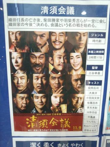 先週の連休に三谷幸喜監督の清須会議を観てきました僕と同い年昭和48年生まれの出世頭、大泉洋の秀吉は堂々たるもので若いころにサイコロ振って深夜バスで右往左往していたのが信じられないぐらいの名演技でした楽しみが半減するので内容は言えませんが歴史の名場面がテンポ良く描かれていて面白かった~チャンスがあればぜひ!!