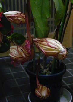 夜に花を咲かせ、一晩しか花を咲かせない事で有名な「月下美人」。一昨日の夜、2個、昨日の夜、12個、咲きました。(=*^ェ^*=)♪これから咲きますよ~、の図。(夜7時30分頃)咲きました、の図。(夜10時ぐらい)お花は綺麗ですが、強烈な香りを放ちます…。12個、一気に咲いたので香りも半端ない…。翌日の今日の姿…。しぼみましたよ…、の図。お花はしぼみましたが、まだ部屋中、月下美人の香りが充満しております。匂いはきついけれど、お花は綺麗♪また来年見れると良いな~。(^ω^)♪あ、ここからは、備忘録用。。。家の瓦がこの前の地震で数枚落ち、この前の大雨で屋根のセメントも数か所落ち、「屋根屋さんに来てもらわないとね~」と言っていた矢先、今回の東から西に向かう異例の台風のせいで何故か?1階の天井から雨漏りして床の一部がびちゃびちゃに…。2階は無事でした。雨漏りしている場所が、屋根瓦が落ちたりセメントが落ちている場所とは違うので、父曰く、雨漏りした辺りの、とゆが詰まっているのかも?そこから、いつもと違うコースの強風豪雨の影響で、屋根の隙間から雨水が入ったのかも? などなど言ってましたが、阪神淡路大震災時の屋根瓦の微妙なずれが、(当時、屋根も修理はしてますが…)年月とともに、かなりずれてきてるのかも…だし。早めに屋根屋さんに来てもらわないとね~。強風の影響で、斜め向かいのお家からは、屋根の一部が我が家の玄関近くに落下、お隣の庭にも落下、自分家の庭にも一部落下していたらしい…。ご近所さん所も、今回の台風、いろいろ被害出ております。