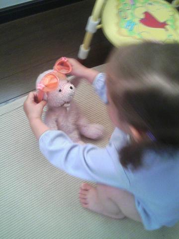 今日は1日、外に出ることなく過ごした私とべーさん。台風の影響で日中結構な雨が降り続いた。でも夕方には止んで涼しい1日だったけど。午前中にいとこのKちゃんから素敵な小包が♪「べーさんに良かったら使って!」とかわいいMiffyの棚セットと先月行ったグアム旅行のお土産。ありがと~~~!!今日8月9日は、大変「身内ネタ」なのだけど、べーさんの相棒くま君がうちにやってきた日。ちょうど去年の今日、我が家にやってきた。昔の職場の先輩、Nさんからプレゼントされたくま君。最初の数ヶ月はべーさんはまったく興味がなかったようで、「あまり使わないおもちゃ箱」の中で細々と暮らしていた。それがある日突然何がきっかけだったのか全く分からないけど、もともとくま君が着ていた洋服をべーさんが脱がし(洋服が気に入らなかったのかしら・・・?)おもちゃ箱から解禁した。それ以来、べーさんとくま君はいつも一緒。外出する時、寝る時、お風呂の時だってたまに脱衣所まで連れてくる(苦笑)そしてべーさんの写る写真の80%はくま君も一緒に写っている状態。実は私も物心ついた時からべーさんが生まれる直前まで(汗)歴代の相棒達がいたタチなのでべーさんの気持ちが分からなくもないのだけど、でも1歳ちょっとすぎの子がこれほどまでに何かに執着(?)したり愛情を注ぐものとは知らずにびっくりした。本当にくま君だけは特別扱いだもんなぁ。何度も洗濯されてとても「1年もの」には見えないくらい年季のはいったくま君だけど、これからもべーさんの大切なパートナーとして、そして我がM家の一員として(笑)よろしく♪何かくま君にプレゼントしてあげたい気持ちにもかられたけど(←やりすぎ?)今朝起きたて1番に最高のプレゼントがあったのでそれに勝るものはないと思って結局ナシ。朝、目を覚ましたべーさんに、寝ぼけつつも「ちょうど去年の今日くま君がおうちに来たんだよ。これからも仲良くしてね~☆チュ~してあげれば?」と言ったら、本当に大切そうに、愛おしそうにくま君にチュ☆チュ☆チュ☆とkissをしていたべーさん。あぁ、感動。くま君、幸せ者だなぁ~~~。ちなみにさっき電話をしてきたJ。開口1番に「Happy Pinkbear(=くま君)s Day!!!」だってさ(笑)さすがくま君。我が家の重鎮だわ。↓去年の今日。くま君と初対面したべーさん。(お隣はNさん♪)きれいなくま君と冷ややかな視線のべーさんが笑える(苦笑)↓「あたちもくまになりたいのよ~」byべーさん。これからも宜しくね~☆