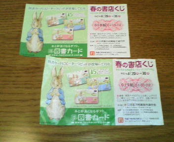 「春の書店くじ」で、4等賞の100円が2本当たりました~ちょうどこの時期に本をまとめ買いしたので、手元に11枚のくじがありました。2枚当選して、残りは9枚。ハズレ券10枚でダブルチャンス賞への応募が出来るのですが、1枚足りなくなってしまいましたよ~ちなみに特等賞は北京4日間の旅ペアご招待だったのですが、どんな方が当選なさったのかな~