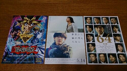 このところ試写会の当選が続いています。 遊☆戯☆王 THE DARKSIDE OF DIMENSIONS 世界から猫が消えたなら 64 ロクヨン 前編 それぞれに楽しみです。