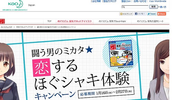 いろんな企業で、色々な萌えキャラ今までも、いくつか拾ってきましたが今度は、月のマークで有名な花王男性層を取り入れたかったのか(C)Kao corporation闘う男のミカタ★恋するほぐシャキ体験キャンペーンギャルゲーっぽい、アンケートなのですが(最後まで行くと商品の説明)まぁ、お暇ならヽ(´Д`;)ノ Shinbunya(のり)に直連絡する