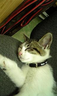 この間自宅に遊びに来るようになった子猫はもう2倍くらいの大きさにまで成長しました。知人の祖母が飼ってくれるはずだったのですが、犬の面倒が大変で断られたそうなので、今では知人の会社でのんびり毎日を過ごしています。おまえ毎日美味しい餌貰えてよかったねぇ~~~。おぃおぃ拾ったあげた私が遊びに来てるのに…ず~~っと・・・寝てました。。。