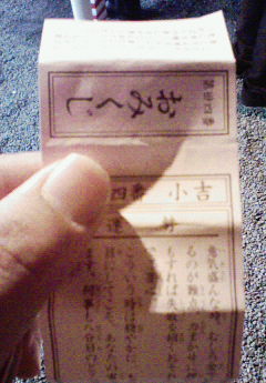当然御神籤バトル!!さて・・・・皆さん明けましておめでとうございます。今年もよろしくお願いします。いつもどおり今年も・・・・いつもの神社に行き・・・・いつもの場所で御神籤を引く。恒例となっているベビーカステラを頬張り・・・・あと何度・・・・この繰り返しができるだろうなとふと思う。神社からの帰り道に通る真っ暗な小学校の横を通りながら・・・・この繰り返しが、私に季節を感じさせるのだ。で・・・肝心の御神籤バトル・・・・私は代金を支払い腕まくりをした。今年負けない・・・・このヒキにすべてを賭ける!!と星ヒュウマのように燃えていた。そして・・・・念を込めて引いた。結果は・・・・小吉だ・・・・で肝心の対戦相手の彼女だが・・・・・・・また負けた・・・・何度負けるのだろうか・・・・ヒキが弱い・・・今年も破滅の香りがする・・・・そういえば・・・・年末の格闘を見たのだが・・・やはり心躍るのは他人の強い精神力を見たとき・・・物資に限りあれども精神に限りは無い。まさにその通りだと思うのだ。無理だと思えるようなところから・・・・魅せる精神力・・・・あれに私は心動かされる。今年は・・・・より強い精神の博徒でありたいと思うのだ。今まで以上に・・・・失うことを恐れぬ一貫性を魅せたい。今年は・・・・いい加減、報われたと思えるような・・・・大逆転がしたい。確かに私に競馬の才能は無いが・・・・・積み重ねと一貫性で・・・・才能の無さを克服したい。今年は魅せる年。そうありたいと思うのだ。まだやるのか?と他人が驚嘆するくらい・・・・譲りたくない、一貫性を・・・・他者が応援せずにはいられないような・・・・そんな勝負を続ける一年にしたい。今年こそは・・・・他人が羨むほどの大逆転をっ!!
