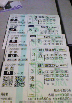 どうだろう・・・トントンくらいまでは持ち直しただろうか・・・さすがだな、後輩君・・・ただ・・・中京11Rのマースエンペラーが+26kg何が起こるのかわからないのが競馬だが・・・これはちょっと苦しいかもしれない・・・まあ・・・ダンツホウテイの3連複が意外についたので、大破滅はないと思うが・・・祈るような気持ちで見守りたい・・・にしても・・・最近の民報や短波ラジオでは・・・関東にいては京都9Rの実況を見ることができないのだろうか・・・ヒリツキ損ねた分、ひどく損をした気分になる・・・だが・・・やはり私は宇宙一ツイているのだ・・・明日・・・特大の馬券を仕留めてやりたい。勝負だ・・・さて・・・そろそろ床屋にでも行くか・・・