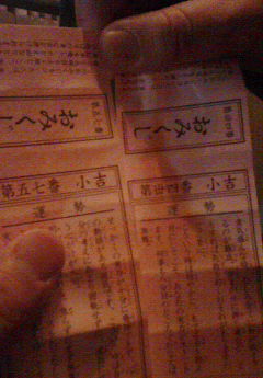 タイトルくらい・・・こうしなきゃならないだろうか?皆さん、明けましておめでとうございます。昨年はお世話になりました。今年もよろしくお願いします。さて・・・最近、毎年のように競馬で年間1回は魅せることができていると思えるので・・・2009年も他者が応援せざるを得ないような熱い漢の魅せる勝負をしていきたいです。結果如何を問わず・・・一貫性こそ私の魅せどころ・・・・まずは金杯で・・・乾杯・・・宇宙一ツイている漢として・・・最早完敗はないと断言したい。まだ馬柱を見ていないので・・・予想の予の字もないが・・・勝負は懲りずに仕掛けたい。にしても・・・年末年始とホールに行かなかったのは何年ぶりだろうか・・・年々、ホールの事情も厳しくなっていく気がする・・・打ちたい台もあまりないし・・・博打にならんな・・・そういえば、年始からFXってやっているのね・・・米ドル・・・大幅な円高にはなっていないが・・・以前勝負はしづらい・・・今年も難解な一年になりそうだ・・・で・・・今年も彼女と年末の商店街を練り歩き・・・年末独特の慌しさと活気を堪能し・・・スーパーで高級食材を購入して食事をした。そして・・・いつもどおり、伊勢山皇大神宮にて初詣を済ませてきた。ここ、京急日之出町駅から横浜WINSの方に上っていった裏にあるのだが・・・自宅から徒歩でいける割には神奈川で3番目に大きい神社らしい。川崎大師・鎌倉八幡宮の次らしい。近い割には悪くはない。で、彼女といつもの年明け御神籤バトル・・・結果は・・・小吉VS小吉でドロー・・・ロクなことがかかれていなかったが・・・宇宙一ツイているので大丈夫だ。私の今年の願い事は今年も宇宙一ツイていますようにだった。死ぬまで言い続けてやる・・・そういえば・・・年末の格闘技を見たが・・・・桜庭対田村の試合・・・良い勝負だった・・・ミルコクロコップもやはり異常に強い・・・セームシュルトは寝技でも強いと思い知らされた・・・なかなか感動できない不燃物の私を燃えさせてくれたのだから・・・・いいモノを魅せてもらったということなんだろうな・・・桜庭ー田村戦は・・・さて・・・明日からまたギャンブル生活といこうかと思います。文無し帝王だけれども・・・では・・・おやすみちゃん・・・