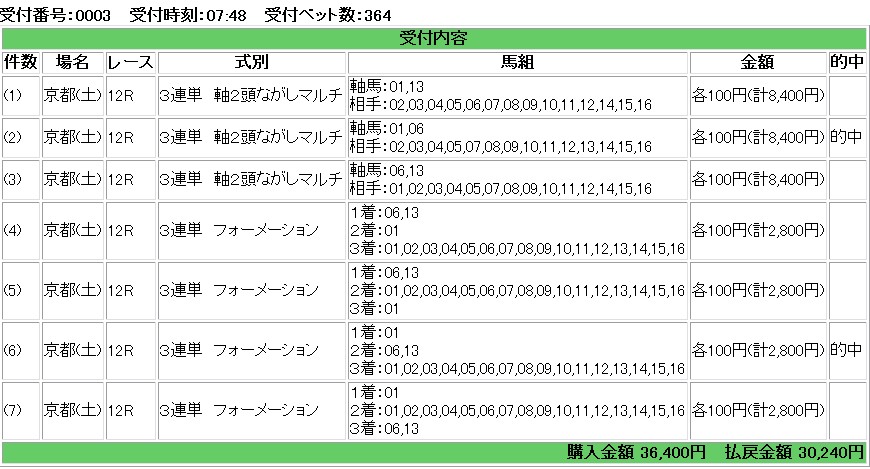 ・・・平坦な己が信じる道を・・・時折、落石によって迂回させられる・・・本来なら・・・落石がなければ幸運な結果を享受しているはずなのに・・・・・・今日も後輩は凄かった・・・いや・・・すごいなんてもんじゃない・・・我が優秀な後輩君↑http://blog.livedoor.jp/longshotm/対価出した後輩の予想ページ↑http://doronuma2.blog83.fc2.com/京都の12Rの予想はまさに神・・・14番人気の馬に○をうち・・・○ー◎できまり・・・馬単・馬連共に高配当・・・これが土日なら・・・私も相当にいい思いをしているのだが・・・仕事中で・・・12Rだけ買えなかったのだ。無論・・・予算も12Rにあらかじめ買えるだけの予算が無かったことも原因だが・・・いつもの私なら・・・間違いなく3連単を取れている・・・・仕事にかみ合ったりと・・・どうも・・・信じる道は正しいのに、障害に阻まれている感じだ・・・まあ、当然のように私も浮いてはいるのだが・・・物足りない結果・・・中山9Rも当たったが・・・こちらは画像を取り損ねた・・・というよりも・・・今日も買うと記載していたレース4分の3くらい当たっているのではないだろうか・・・しかもそれなりに高配当・・・すごいな・・・年明けから好調だ。私も・・・ひとまず、2連勝・・・・これもなあ・・・2~3着にもう少し変なのがいれば・・・・堅すぎた・・・といっても後輩の印どおりで多分決まっているのだろうから・・・勿体無いとしかいいようがない。もう少し厚く取れてもいいはず・・・ただ・・・本当に悔やむのは今日の京都12Rだ・・・絶対に買えば獲れている・・・後輩の○ー◎できまって3連単6000倍・・・仕事さえなければ・・・・一応・・・中山金杯の方はトウショウ丼をこじんまりと頂戴したが・・・・・・・年末から年始にかけての後輩の好調ぶりはやばい・・・ただ・・・相変わらず何かに阻まれているかのように・・・私は言うほど儲かっていない・・・あの予想で私の買い方なら・・・2000Kは勝たなきゃ駄目だ・・・にもかかわらず・・・買い方が下手すぎる・・・いや・・・タイミングがかみ合わなさ過ぎる・・・ここで生き残らないと・・・・ちょっとミスったら致命的になってしまうのだから・・・・で・・・後でこの結果を知って臍をかんだのだが・・・本日は仕事後に麻雀・・・なんとか強欲おぢさんとキャバ嬢に水道水を強要する漢相手に勝利を飾る事ができたが・・・取り逃した馬券と比較すると涙しかでてこない・・・まあ・・・トウショウ丼拾ったからいいかと思うが・・・これも・・・仕事のため、少ない予算で買ったのが的中・・・一日競馬できていたら・・・なんだろう・・・宇宙一ツイているというのに・・・この針の穴を通すかのような細い道をわざわざ選択している・・・悔しいなあ・・・だが・・・再認識した。やはり、私の選択眼は正しい。後輩はありえないレベルの精度を持っている。私が50年学ぼうとも決して追いつくことはないと断言できる。こういう障害による取りこぼしがなければ・・・年間の蔵は楽勝のはずなのだが・・・・まあ・・・次の土曜日も仕事・・・月曜日は当番・・・思い切った勝負が出来ないのがもどかしい・・・そしてかみ合わない・・・まあ・・・大した事だとは思わないが・・・FXの方は・・・もう負けない宣言をしただけあって・・・どうにかNZドルの損切り分を含めても浮いている・・・・明日の朝一・・・円安に進まなければ・・・・それなりに差益を取れそうな雰囲気だ・・・どうしたものか・・・考えどころだが・・・・1取引の利回り10%を狙いたい・・・・さて・・・明日も仕事なのでもうお休みちゃん・・・・