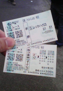 さて・・・本日は久しぶりに博打を打てた・・・・事の起こりは・・・こうだった・・・起床すると、私のプライベート電話がチカチカしている・・・・何事かと思っていると・・・暇井さんからの召喚だった・・・なので、ノコノコと川崎大師に向かう私・・・・冷えるなと思いながらマフラーを首に巻き・・・自宅に鍵をかけて駅へと向かった。自宅横のコンビニにより、ガムと暖かいお茶を手にし、切符を買う。振袖姿の女性もちらほらと駅で見かける。正月だよな、周囲の雰囲気から再確認するも・・・何も感慨深さは感じず・・・京浜急行の各駅に揺られ川崎駅に降り立った・・・すると・・・暇井さんとリンク先のH氏、そしてもう一人の後輩がいた・・・で・・・川崎駅から大師線に乗った直後・・・H氏が・・・N島さん、宝船特別がありますよと一言・・・宝船特別・・・宝・・・七福神・・・蔵・・・・・・そりゃ大変だ!!是が非でも宝船に乗船しなければ・・・・なので・・・急遽・・・川崎大師に行く予定が・・・川崎競馬場へ・・・そして・・・宝船・・・船と言えば・・・やはり満ち潮、引き潮、海、川だろうと話していたら・・・丁度・・・満ち潮に関係のある・・・ムーンライトクロスが・・・おまけに母の父がリバーマン・・・川だ!!これしかないと思い・・・・こいつから3連単と単勝勝負・・・始終苦しそうな競馬だったが・・・なんとか先頭でゴールインそれがこれ・・・3連単も意外につき・・・宇宙一ツイている漢として当然のスタートを切ることができた・・・その後、返し馬で散々いいと言われていたのに、手を出さず・・・一番人気のマルヨフェニックスから行き、撃沈・・・最後ノゾミヒカルから行くも・・・ウスイノゾミとか言っていたら・・・一瞬勝つかと思われた手応えなのに・・・直線残り50mで掴まる・・・残念な結果に・・・結局は+10Kだった・・・・で・・・箱根駅伝とか見てきた我が後輩たちと川崎のモツ鍋屋に・・・あまり興味ないので知らなかったのだが・・・我が母校は10位らしい。ふーん。その後、横浜付近の住む会社の人たちと飲んで帰宅・・・久しぶりにアルコールを摂取してきた・・・・酒はいいね。酔えよ、さらば救われる・・・明日は最後の正月休みだが・・・英気を養いたいものだ・・・そういえば・・・TUTAYAで森に棲む悪魔という映画を借りてきた・・・見たのだが・・・これ途中までは非常に面白い。何かが起きそうな感と・・・雰囲気は一流なのだ・・・・ところが・・・ストーリーと・・・展開にがっかり・・・もうちょっとシナリオがよければ凄いいい映画だと思うのだが・・・・なかなか感動できる凄い映画というものはすくないが・・・雰囲気を味わうなら、この映画はいいかもしれない・・・布石も何もないけれども・・・映画「交渉人」のようなすごい映画はあまりないんだろうな・・・さて・・・金杯の出走馬が決まった・・・トウショウ丼とか思っていたら・・・・中舘先生ですか・・・逃げのローカルならまだしも・・・中央重賞で差し馬・・・厳しいかなあ・・・・なんか騎手で買えば良さそうに見えてくる・・・京都のほうは・・・・先行する馬がすくない・・・・これなら・・・ブラボーデイジーを再度買いたい気分にさせられるが・・・どうなのだろう・・・新聞を見ないとなんともいえないが・・・・ま・・・明日の東スポを見てから再度詰めたい・・・・