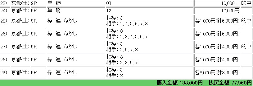 さて・・・詳細の更新はいつもどおり日替わりのときに・・・編集作業やります・・・にしても・・・神がかっているなあ・・・そんなに・・・ドラマ性を高めなくてもいいのに・・・・次の逆転をまた1つ劇的にしてしまった・・・・にしても・・・やはり狙っている馬4頭に・・・・すべてを絞った方が良さそうだな・・・回避している時点で・・・確勝だったんだろうな、あの馬・・・・さて・・・詳細はまた3時間後くらいに・・・