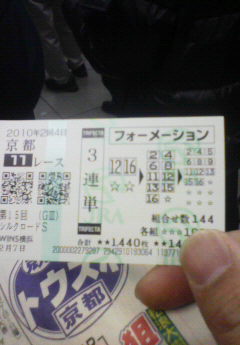 さて・・・私が勝負したレース週明けから後輩がずっと勝負だと言っていた馬が勝った・・・・個人的にはまさか私が狙っていた馬と同じレースにそいつが出走するとは思わず、かなり意外な展開だったが・・・後輩の文面をみてどっちかが勝つだろうと思ったため・・・・エーシンウェズンからしこたま行く予定を変更し・・・勝ち馬からも馬券を買った。おかげで・・・大布石からはギリギリ生き残ったが・・・なんというのかなあ・・・すべてが合致はしないものだな・・・エーシンウェズン好スタート切ったのでそのまま逃げてくれるかと思いきや・・・競馬を覚えさせるためか何か知らないが・・・無理やり抑えて引っかかりっぱなし・・・・あれでは負けても仕方がない・・・セレスロンディーがあれだけ粘っていた事を考えれば・・・・きっちり逃げていたら間違いなく連には絡んでいただろうな・・・まあ・・・1Rの1頭入魂する予定だった馬が飛んで回収率が50%越えているなら大健闘と言えるだろう・・・くそ・・・勝ち馬が抽選潜り抜けていたら面白かったのに・・・・まあ・・・若干資金が残ったので・・・また狙っている馬の残りの3頭が出走するのを待つか・・・一応、遊びで観戦料を京都記念とクイーンカップを購入しておこうと思う。次々・・・にしてもなあ・・・考えてみればツイているな・・・エーシンウェズンがあの競馬されたら・・・・勝ち馬がいなかったとしても多分駄目・・・後輩に最後の最後で救われたということだろうか・・・ただ・・・相変わらず弱いのが京都の6R・・・後輩の本命が単勝10倍越えで勝っているのだ・・・・・それを拾っていないのが弱すぎる・・まあ、1R入魂予定だったため仕方がないか・・・最近相互紹介したので紹介しておく。我が優秀な後輩君↑http://blog.livedoor.jp/longshotm/対価出した後輩の予想ページ↑http://doronuma2.blog83.fc2.com/そのうち後輩の予想を参考にした結果馬券を編集しようかと思うが・・・ここのところ好調とはいえないが、私は一貫して信じる・・・さて・・・そろそろメインを買ったら諸々準備だな・・・