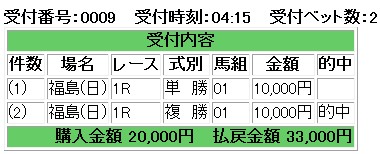 みなさん、こん××は。*N島です*どうです?このオリジナリティ溢れる挨拶は・・・決してパクリや模倣ではありません。〇△□と違い・・・×は一筆じゃ書けない。この時点で他と一線を画していると言えるでしょう。どれもちょっと形を変えただけで一筆で書けるものばかり・・・その点、×は違う。と・・・□と△を使った人がいたので・・・某天才に対抗して×を使用。なんとなく一人勝ち感に溢れている・・・自宅に帰宅したら・・・・すでに3時を過ぎており・・・楽天メンテナンス行き・・・・なんだか404エラーがでて焦ったな・・・・携帯から行くとメンテナンスだとわかって安心したのだが・・・明朝までに復帰しているだろうか・・・さて・・・今日も仕事ちゃんだが・・・まずはこいつから・・・馬フィードhttp://umafeed.com/in/2957↑馬フィードランキングそこそこ頑張っています。応援クリックよろしくお願いします。で・・・いつもの我が優秀な後輩我が優秀な後輩君↑http://blog.livedoor.jp/longshotm/対価出した後輩の予想ページ↑http://doronuma2.blog83.fc2.com/昨日も秀逸で・・・馬単40倍を2点で当てていた・・・・しかも推奨で・・・・これを枠連15K入れたはいいが・・・・馬単と馬連を入れなかったことが悔やまれる・・・・そして・・・くりりんの分さん・・・すごすぎるだろ・・・くりりんの分さんhttp://blog.livedoor.jp/qririn/archives/65330341.html↑くりりんの分さん僅か1Rで1600Kって・・・・おまけにいいところしか拾っていない・・・・この感性と嗅覚が本当にすごい・・・・ううむ・・・それに比べると私のこの馬券・・・下手すぎる・・・↓これね。馬単も馬連も抑えておかねばならぬよなあ・・・・馬単40倍ですぜ・・・しかも相手2点で・・・・これを10K抑えておくだけで400Kか・・・・これは弱いなあ・・・・そして・・・・福島牝馬は天才と関東総大将が消しているブラボーデイジーとレジネッタを入れたはいいが・・・重馬場の福島なら絶対アルコセニョーラだろうと思っていたのに・・・晴れていた・・・そして痛恨の鼻差でトリガミちゃん・・・・笑えないなあ・・・・アルコセニョーラ3着なら・・・・3連複を0.6K以上持っており、230倍ついているのに・・・・にしても・・・恐るべきは関東総大将の優曇華さん・・・見事消した2頭で決まっている・・・敬意もどんどん重くなる・・・惚れそうだ・・・・あとはしょぼいレースを一つ的中した程度・・・まあ、無論浮いているのだが・・・物足りない・・・・同じ武器を振っているのにくりりんの分さんの活躍を見れば致し方ないが・・・・本日のあの馬と諸々で勝負だろうが・・・気になっていることがある・・・前回人気薄のあの馬が魅せたからといって・・・皆急に印が回りすぎ・・・危険な気がしてならないのだ・・・だが・・・もう端から降りるつもりなど皆無ちゃん・・・・1000万馬券を狙っていきたい・・・にしても・・・・再度差を思い知らされた・・・やはり馬券は・・・・安全そうな完全を感じる馬券よりも・・・何かを克服したらといった条件付きの馬券の方がよいのかもしれない・・・本日メインのあの馬・・・・完全なんだよなあ・・・完全すぎることが不安だ・・・・が・・・・致命傷を負わずして、一撃を狙いたい。他にも明日は買わなければならない馬が多数いる・・・どうしたものか・・・いつかの菊花賞の轍を踏まぬためにも・・・先にあの馬を買っておこう。そういえば・・・ここからはちょっとシリアスネタ・・・世の中・・・当たり前のことを当たり前にできる人って意外に少ない。驚くほど適当で、対価を受け取っているということに大して当然の権利であると思っている人間だとしか思えない人も結構いるんだなと思わされた。何故彼らはあんなにも確認しないのだろう・・・・問題を起こしたいと願っているとしか思えない。面倒事をしないことと信用を天秤にかけて前者が重いとしか思えないんだよなあ・・・おかげで・・・私がまだ十分に社会生活に耐えうる資質を持っていることを再認識させてくれるのだから・・・感謝すべきなのかもしれない。にしても・・・近い未来をイメージしないのだろうか・・・因果関係を脳内にフィルムとして落とし込み、映像化させないのだろうか?疑問は尽きない・・・・で急に話は変わるのだが・・・今日の現場で四捨五入して不惑の女性が景品交換のカウンター業務をやっていたのだが・・・ちらっと話を聞いたら・・・派遣登録しながら、アルバイト2つ掛け持ちしているらしい・・・見た目が若々しく、とても四捨五入して不惑とは思えないのだが・・・何が彼女をそれほどまでに労働へと駆り立てるのだろうか?暇があれば働くんですと言っていたが・・・立派なことだと思う反面・・・・時間という自分の命の細切れを安価で提供していることへの疑問・・・もっと、効率よく、時間と経済力を同時に手にする手段はあるはずなのだ。他人は偉大だと思いながらも・
