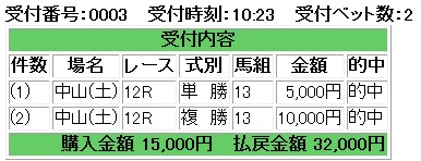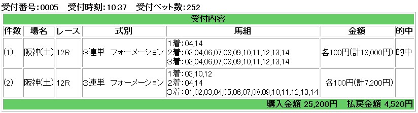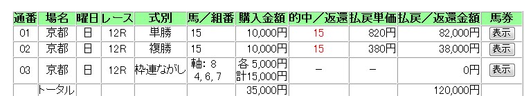 くっ・・・・下手すぎて何も言えない・・・後輩の阪神12R・・・本日の中山4Rに引き続き1点的中なのに・・・・ちょっと欲を出して1番人気が消えてしまうことを願ってしまった・・・枠連で買おうと思ったが、1番人気が同枠だったので3倍しかつかなかったため、ヤメ・・・そして・・・1点的中の予想を信じているのに、痛烈なトリガミという泣ける結果に・・・・馬連1点でいいじゃない・・・まあ・・とりあえず買ったレースで6戦4的中なら、そりゃ浮くが・・・もう少し大儲けしなければならないところだ・・・・本来なら・・・完全に買い方でチャンスを獲りこぼしている・・・・くりりんの分さんの買い方はすごい・・・今晩の画像が楽しみで仕方がない・・・くりりんの分さんhttp://blog.livedoor.jp/qririn/archives/65327606.html↑くりりんの分さん中山の後輩の予想に単勝80Kらしい・・・・すごいな・・・・この嗅覚・・・・一応・・・私の本日の結果画像をアップしたらお出かけします。後輩のコメントに馬連とワイド1点と書いてあるんだから・・・何故25Kをそう買わなかったのか・・・・どう考えてもー20Kになるような予想ではない。馬連1点なら70K以上は回収しなければならないし・・・仮に枠連だとしても20K入れて70K・・・・馬連・ワイドそれぞれ1点10Kでよかったとしか思えない・・・これが私が布石を打つ要因・・・・そう思わされて仕方がない・・・猛省だ・・・・さて・・・明日も後輩に期待したい・・・では・・・・レレレのレー